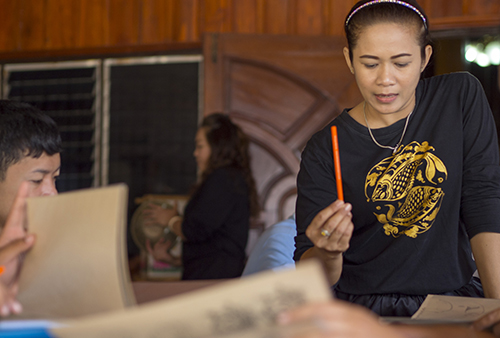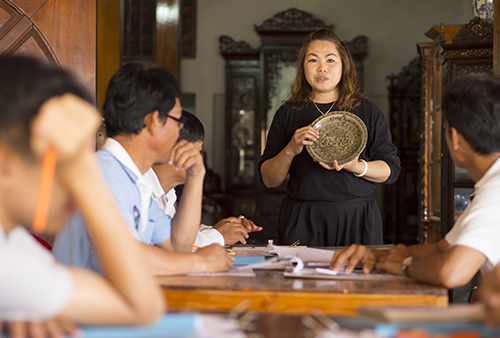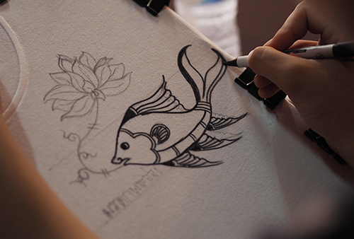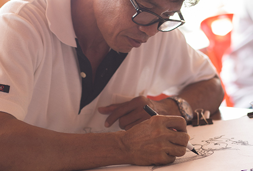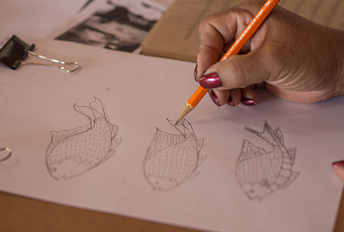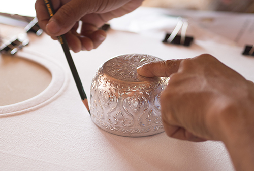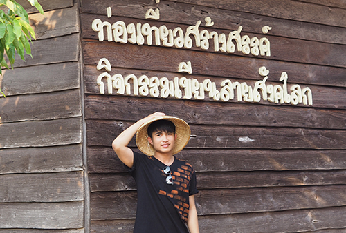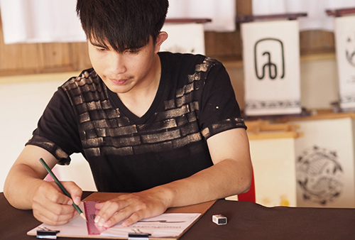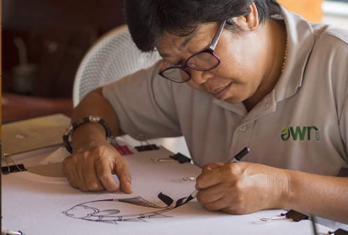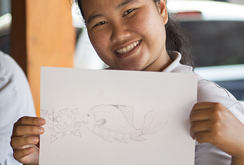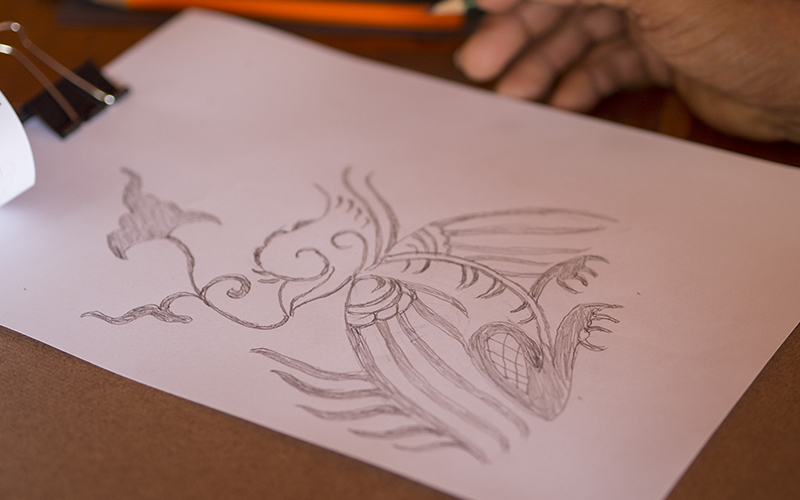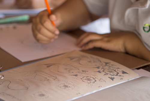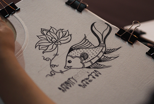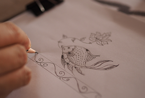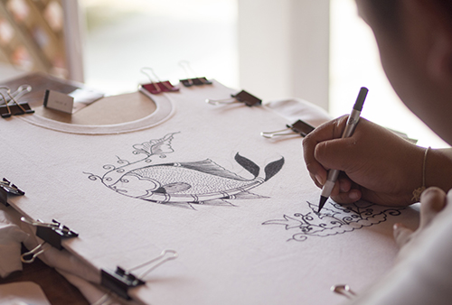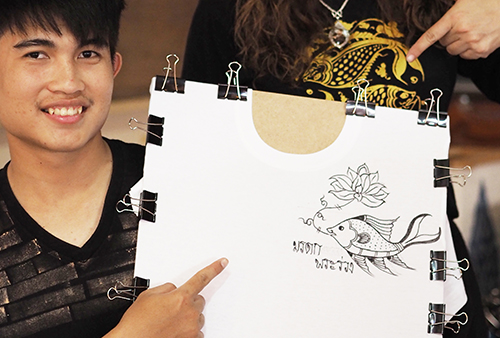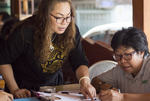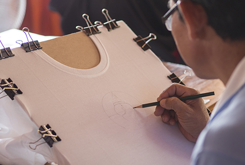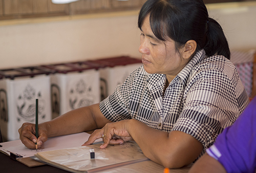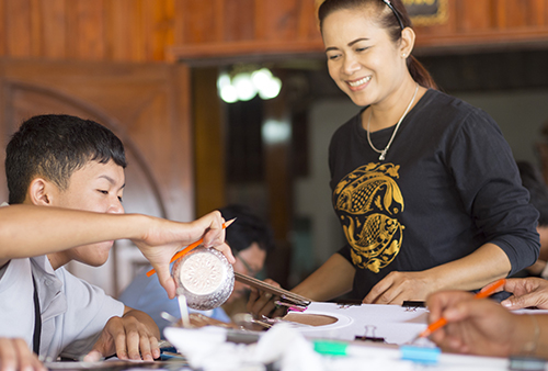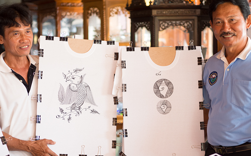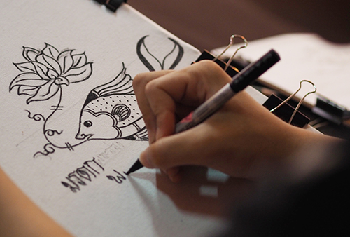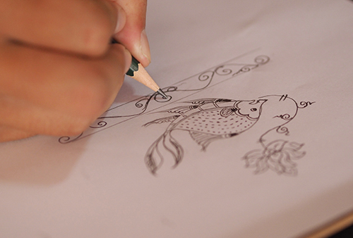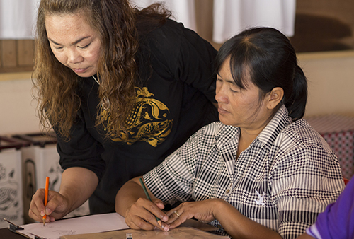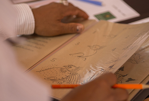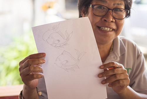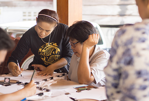 - นักท่องเที่ยวเลือกวัสดุ และเลือกลวดลายที่ชอบแล้วนำมาทดสอบวาดลงบนกระดาษโดยมีผู้เชี่ยวชาญสอนและให้ความช่วยเหลือ