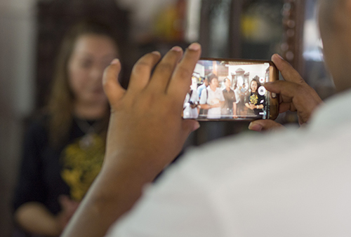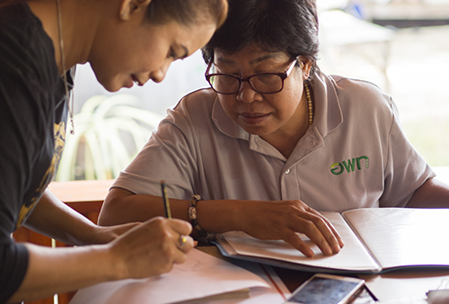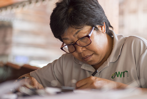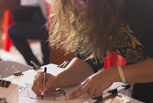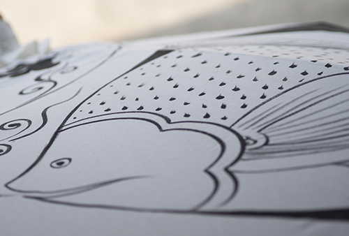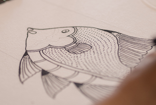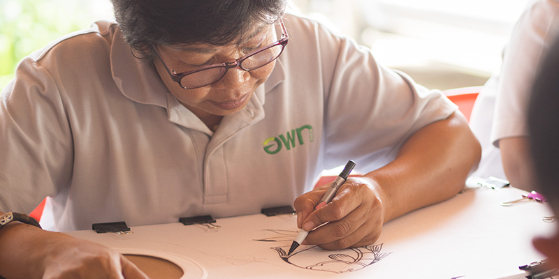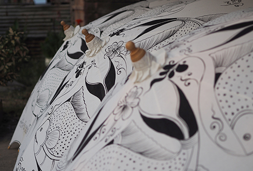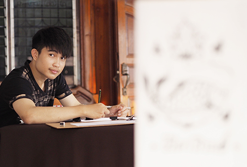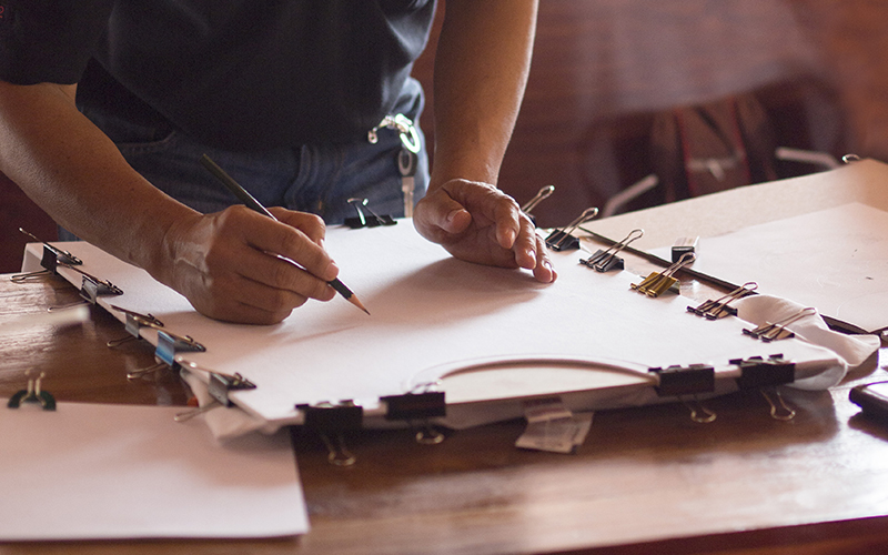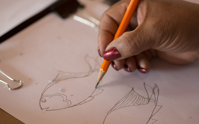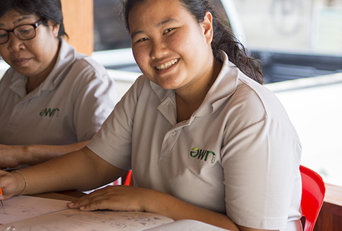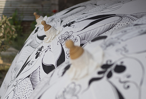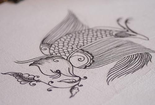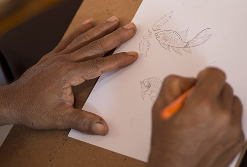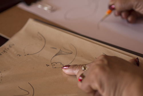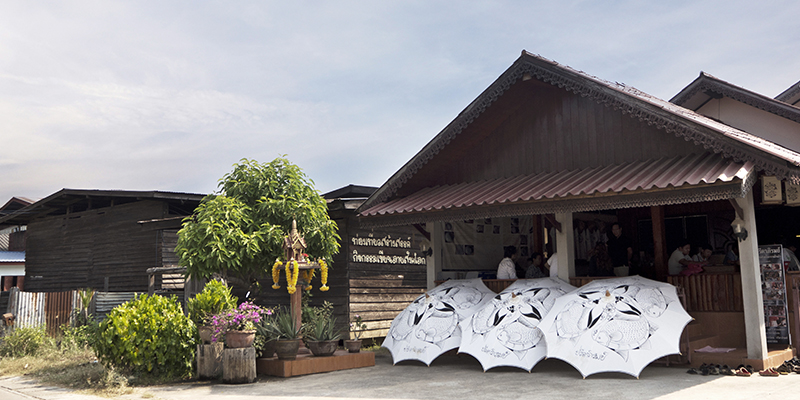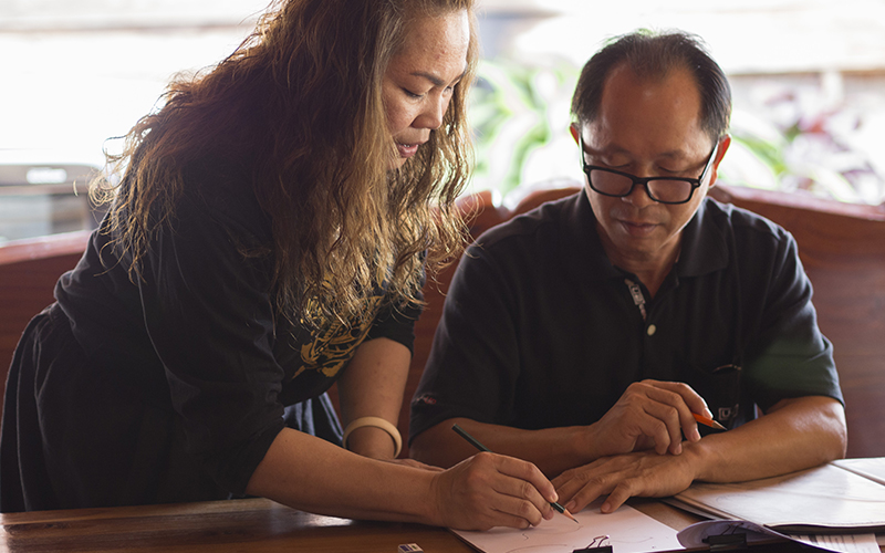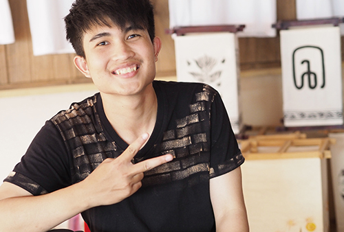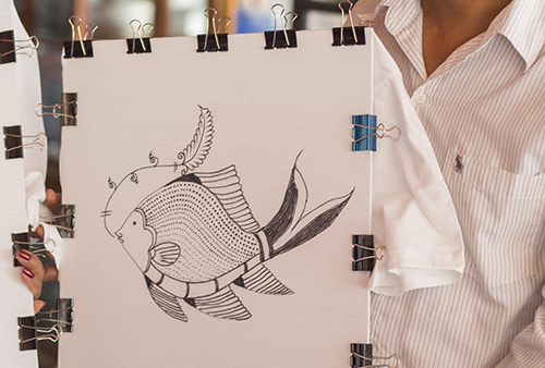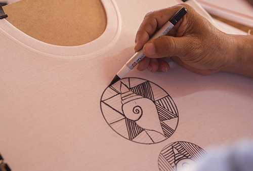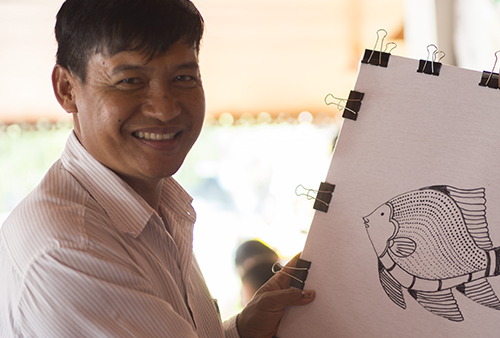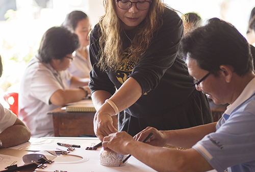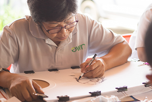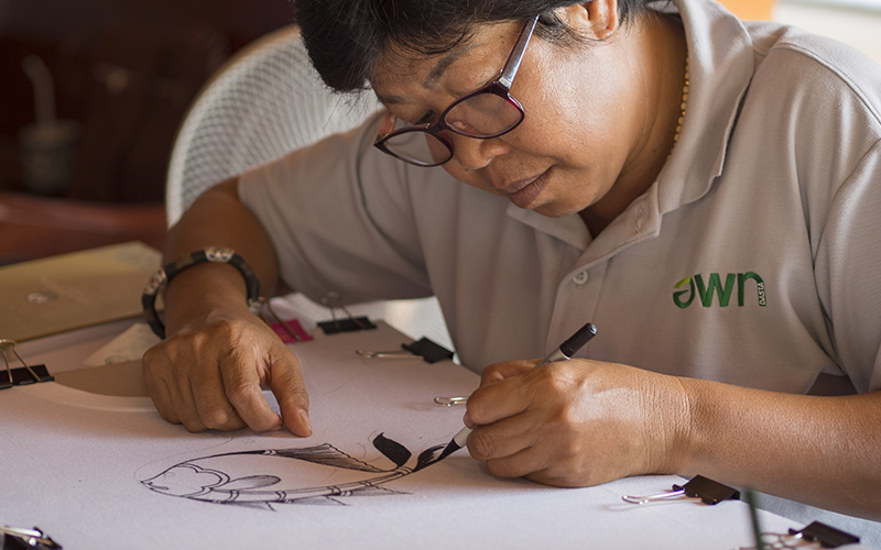 - นักท่องเที่ยวเลือกวัสดุ และเลือกลวดลายที่ชอบแล้วนำมาทดสอบวาดลงบนกระดาษโดยมีผู้เชี่ยวชาญสอนและให้ความช่วยเหลือ