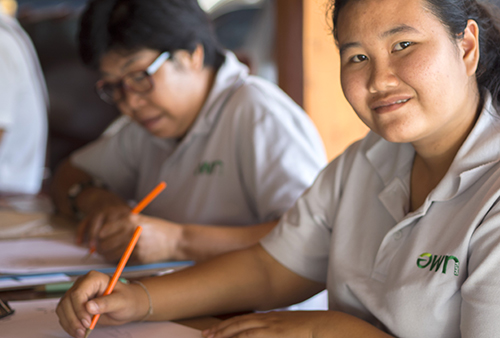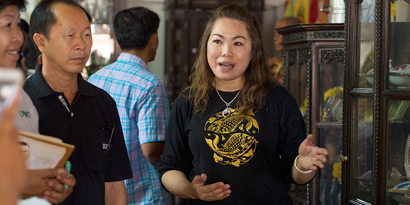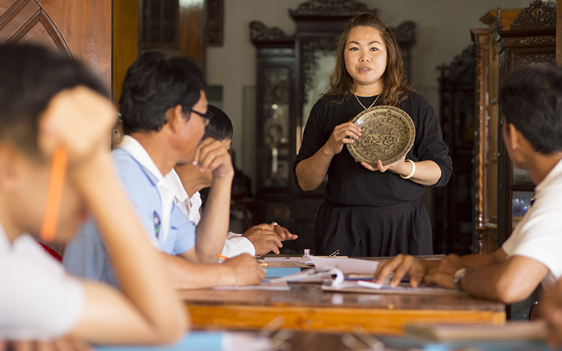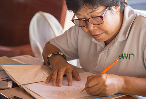 คุณธารารัตน์ ปรีดาภิรมย์ ได้ฝึกฝนการเขียนลายจนชำนาญ และเข้าร่วมอบรมกับ องค์การบริหารการพัฒนาพื้นที่พิเศษเพื่อการท่องเที่ยวอย่างยั่งยืน (องค์การมหาชน) หรือ อพท. พัฒนากิจกรรมท่องเที่ยวเชิงสร้างสรรค์ให้นักท่องเที่ยวได้มีประสบการณ์เรียนรู้ประวัติศาสตร์ผ่านการเขียนลายสังคโลกบนผืนผ้า
