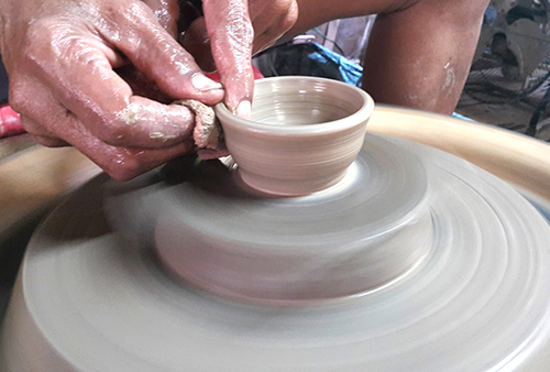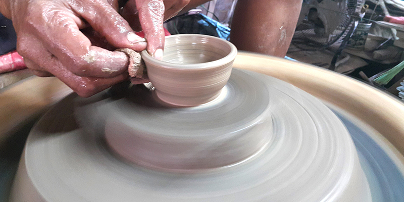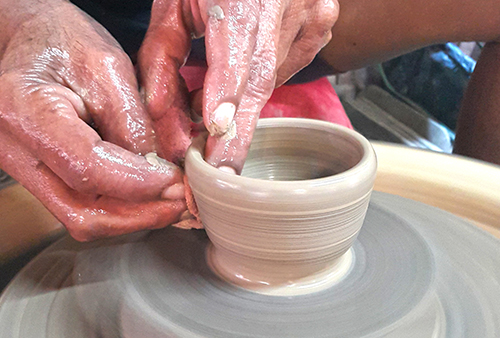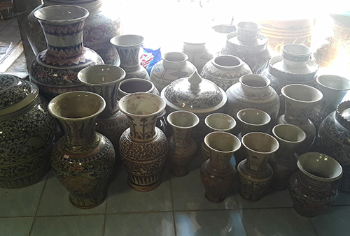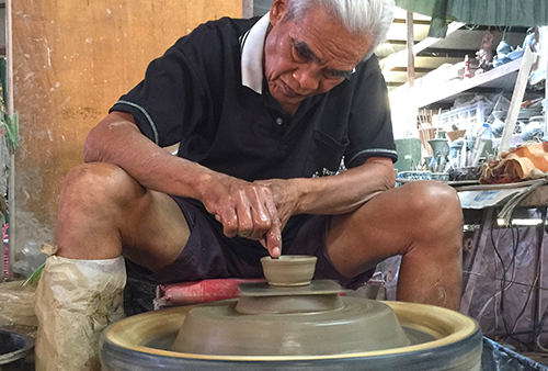 2. ขั้นตอนการเขียนลาย ร้านจะเตรียมอุปกรณ์ไว้ให้นักท่องเที่ยวทั้งสีเขียนลาย พู่กัน และภาชนะ นักท่องเที่ยวสามารถเลือกเป็นจานหรือแก้วกาแฟหูช้างก็ได้ เมื่อนักท่องเที่ยวเขียนลวดลายต่างๆ เสร็จแล้ว ร้านจะต้องนำผลงานไปเคลือบและเผาในเตาเผาขนาดใหญ่ ด้วยอุณหภูมิ 1,250 องศา แต่จะต้องรอให้มีขอเต็มเตาก่อนจึงจะเผาได้ เมื่อได้ผลงานออกจากเตาแล้วทางร้านจะบริการจัดส่งชิ้นงานให้ลูกค้าถึงบ้าน โดยรวมใช้เวลาประมาณ 3-4 สัปดาห์