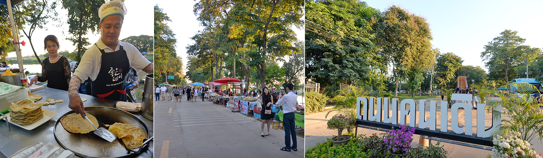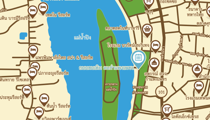เดิน ช็อป ชิม กินบรรยากาศริมฝั่งแม่น้ำปิง ณ บริเวณถนนสิริจิต (หน้าสะพานเกาะกลางน้ำ) ตั้งแต่สามแยกศาลเจ้าพ่อเสือถึงสามแยกไฟแดงด้านหลังโรงพยาบาลกำแพงเพชร พบกับการแสดงที่หมุนเวียนเปลี่ยนไปทุกสัปดาห์ รวมถึงกิจกรรมพิเศษ เช่น การทำลูกประคบ การพิมพ์พระเครื่อง ฯลฯ พร้อมชมสีสันแห่งแสงไฟที่สะท้อนผืนน้ำและบรรยากาศสวยงามยามค่ำคืน และบริเวณด้านหน้างาน มีบริการรถรางนำชมเส้นทางกินลมชมวิวในเขตเมืองกำแพงเพชร เริ่มตั้งแต่เวลา 17.00 น. – 19.30 น. รอบละ 30 นาที