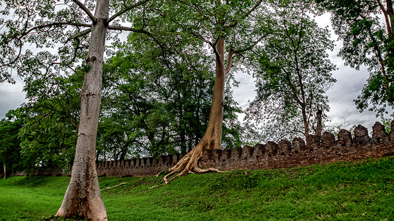 ภายในกำแพงเมือง มีพื้นที่ไม่มากนัก แกนกลางของเมืองเป็นที่ตั้งของศาสนสถานเช่น วัดพระธาตุ และวัดพระแก้ว สิ่งก่อสร้างในวัดเรียงตัวไปตามแนวทิศตะวันออก – ตะวันตก เหลือพื้นที่อีกไม่มากนัก แต่ล้อมรอบด้วยกำแพงเมืองและคูเมืองแน่นหนา ตอกย้ำสถานะเมืองป้อม เป็นปราการที่ทรงพลังซึ่งเมืองต่างๆล้วนปรารถนาจะได้เป็นเจ้าของ