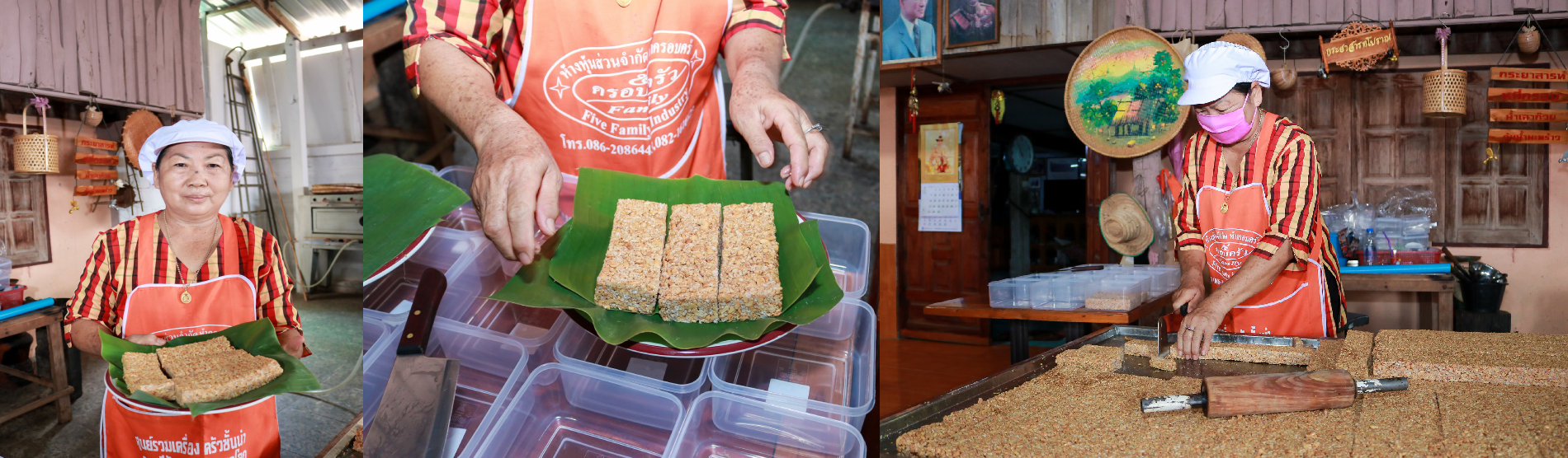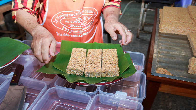 สำหรับในเขตพื้นที่เทศบาลเมืองศรีสัชนาลัย คุณชไมพร ไชยวงศ์ (ป้าอู๊ด) อายุ 59 ปี อยู่บ้านเลขที่ 65/1 หมู่ 3 ต.ศรีสัชนาลัย อ.ศรีสัชนาลัย จ.สุโขทัย นับได้ว่าเป็นผู้ที่เชี่ยวชาญด้านการทำกระยาสารทหรือที่คนพื้นถิ่นเรียกว่า “ข้าวเม่า” ชนิดที่ว่าหาคนเทียบฝีมือได้ยาก ป้าอู๊ดเล่าให้ฟังว่าเริ่มการทำกระยาสารทเพราะมีใจรักและชื่นชอบในรสชาติของกระยาสารทเป็นทุนเดิม เลยเริ่มฝึกทำจากแม่ กว่าจะฝึกฝนจนได้รสชาติเหมือนในปัจจุบันใช้ระยะเวลาเรียนรู้เทคนิคต่าง ๆ นานพอสมควร จากเริ่มฝึกจนถึงวันนี้ทำกระยาสารทมาเป็นระยะเวลา 8 ปีแล้ว ขั้นตอนการทำไม่ยาก ส่วนผสม 1 กระทะ ประกอบด้วย น้ำตาล 6 กิโลกรัม, งาขาว 3 กิโลกรัม, ถั่ว 8 กิโลกรัม, กะทิ 1/2 กิโลกรัม แบะแซ 2 กิโลกรัม เคี่ยวส่วนผสมให้เข้ากัน ใช้ไฟอ่อน ๆ ต่อไปอีกสักระยะ แล้วนำข้าวเม่าใส่ลงไปเคี่ยวต่อจนได้ที่ ยกลงใช้ไม้บดให้เป็นแผ่นขนาดตามความต้องการ ทิ้งไว้จนเย็น แล้วใช้มีดตัดเป็นชิ้นพอคำ สำหรับนำไปถวายพระหรือเก็บไว้รับประทาน ป้าอู๊ดเล่าต่อว่าสิ่งสำคัญที่ทำให้กระยาสารทบ้านป้าอู๊ดพิเศษและมีความแตกต่างจากที่อื่น คือ ไม่ใส่ข้าวตอก และเมื่อจับข้าวเม่าจะอ่อนไม่แข็ง เวลาทานจะไม่เหนียวมากเหมือนสูตรอื่น ๆ ซึ่ง เข้ากับยุคสมัยปัจจุบัน ป้าอู๊ดต้องเคี่ยวข้าวเม่าวันเว้นวันเพราะขายหมดอย่างรวดเร็วต้องส่งขายไปที่ต่างจังหวัดด้วย เช่น ร้านอาหารที่จังหวัดอุตรดิตถ์ หรือ เวลาที่มีลูกค้าโทรสั่งก็จะส่งไปให้ เช่น ลูกค้าจากจังหวัดกรุงเทพมหานคร ป้าอู๊ดบอกว่ายินดีเปิดบ้านต้อนรับนักท่องเที่ยวที่สนใจมาดูกระบวนการทำกระยาสารท (ข้าวเม่า) เพื่อเป็นแหล่งเรียนรู้และจะได้มีขนมของฝากจากท่าชัย-ศรีสัชนาลัย ไปฝากญาติพี่น้องหลังจากแวะมาเที่ยวที่นี่ ที่สำคัญป้าอู๊ดต้องการให้รุ่นลูกหลานได้มาเรียนรู้ ขั้นตอน วิธีการทำกระยาสารท เพราะปัจจุบันหาคนสืบต่อสูตรไม่ได้