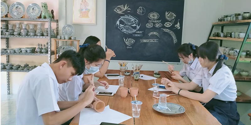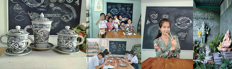 1. วาดลวดลายลงบนงานปั้นภาชนะต่างๆ เช่น ลายปลาหรือลายตามจินตนาการ