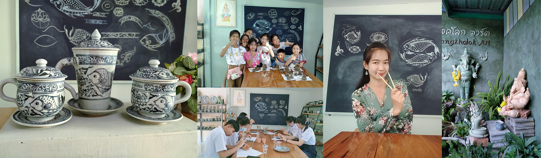 1. วาดลวดลายลงบนงานปั้นภาชนะต่างๆ เช่น ลายปลาหรือลายตามจินตนาการ (ชุดแก้วกาแฟและจานรอง ชุดละ 350 บาท ค่าส่งต่อชิ้นงาน 50 บาท ทั้งนี้ ราคาจะขึ้นกับขนาดภาชนะที่เลือก)