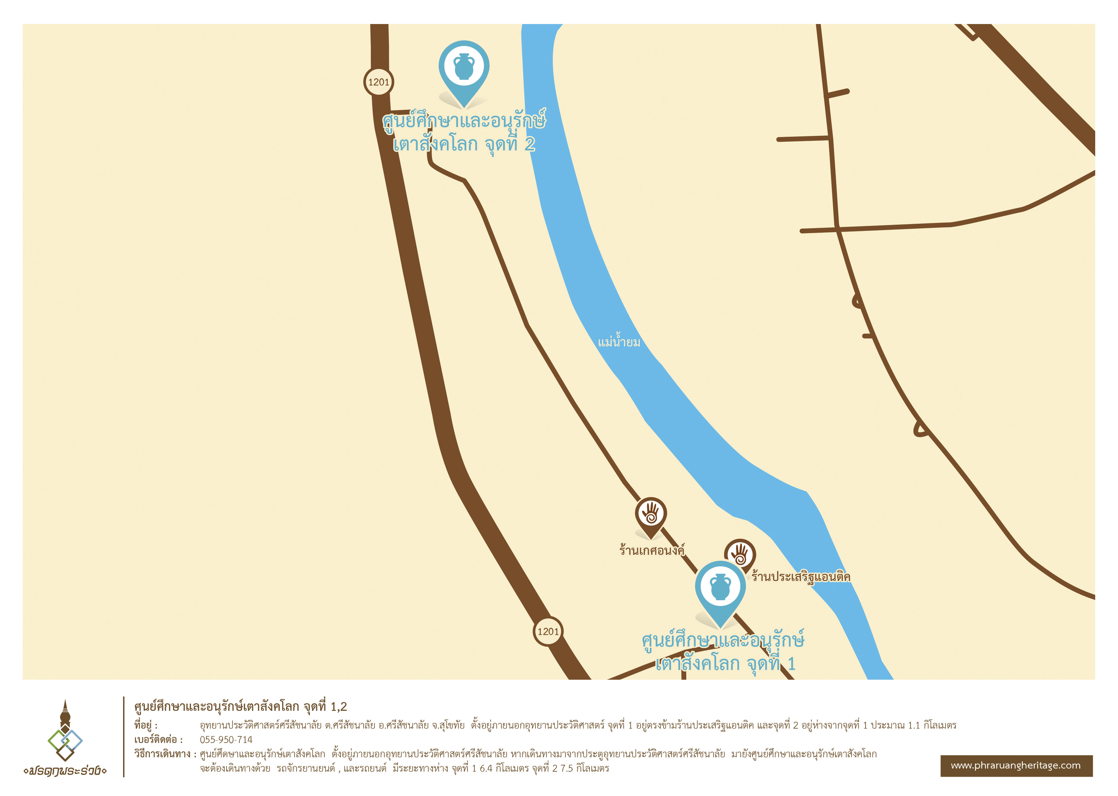ศูนย์ศึกษาและอนุรักษ์เตาสังคโลก จุดที่ 1 อยู่ตรงข้ามร้านประเสริฐแอนติค และศูนย์ศึกษาและอนุรักษ์เตาสังคโลก จุดที่ 2 อยู่ห่างจากจุดที่ 1 ประมาณ 1.1 กิโลเมตร