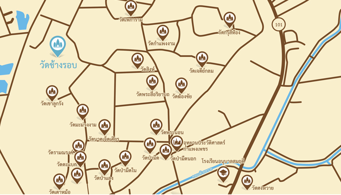 จากอุทยานประวัติศาสตร์กำแพงเพชรเดินทางไป วัดช้างรอบ ซึ่งอยู่ภายในอุทยานประวัติศาสตร์กำแพงเพชร เขต 1 โดยวัดระยะทางจากประตูทางเข้าอุทยานประวัติศาสตร์กำแพงเพชร ได้เป็นระยะทาง 1.5 กิโลเมตร