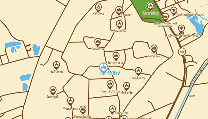จากอุทยานประวัติศาสตร์กำแพงเพชรเดินทางไป วัดสิงห์ ซึ่งอยู่ภายในอุทยานประวัติศาสตร์กำแพงเพชร เขต 1 โดยวัดระยะทางจากประตูทางเข้าอุทยานประวัติศาสตร์กำแพงเพชร ได้เป็นระยะทาง 1.3 กิโลเมตร