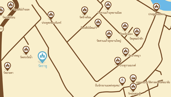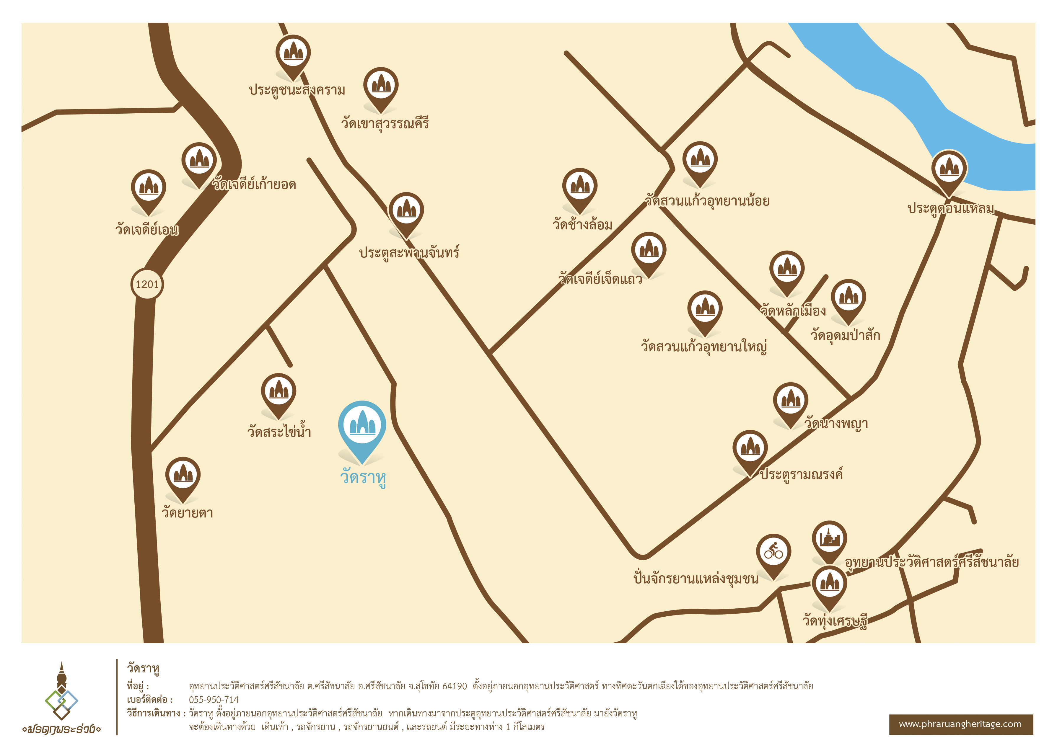 จากอุทยานประวัติศาสตร์ศรีสัชนาลัยเดินทางไป วัดราหู ซึ่งอยู่ภายนอกอุทยานประวัติศาสตร์ศรีสัชนาลัย โดยวัดระยะทางจากอุทยานประวัติศาสตร์ศรีสัชนาลัยได้เป็นระยะทาง 1 กิโลเมตร