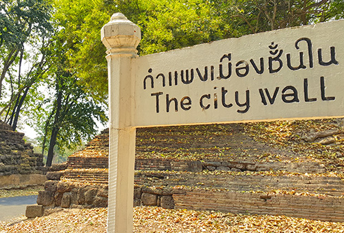 ภูมิปัญญาอันชาญฉลาดของบรรพชนสุโขทัยนั้น สามารถดูได้จากการสร้างกำแพงเมืองที่ล้อมรอบเมืองโบราณสุโขทัยเอาไว้ ศิลาจารึกของพ่อขุนรามคำแหงมหาราช กล่าวไว้ว่า "รอบเมืองสุโขทัยนี้ตรีบูรได้สามพันสี่ร้อยวา" และ "เมืองสุโขทัยนี้มีสี่ปากประตูหลวง" เมื่อนำมาพิจารณาร่วมกับสภาพของกำแพงเมืองโบราณสุโขทัยที่ยังหลงเหลืออยู่ค่อนข้างมาก พบว่ามีลักษณะตรงกัน