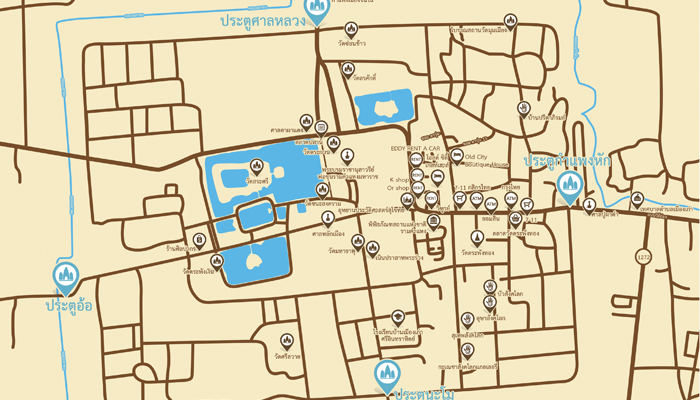 พิกัด : ประตูศาลหลวง (17.02483, 99.70348) , ประตูนะโม (17.01238, 99.70595) ,