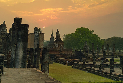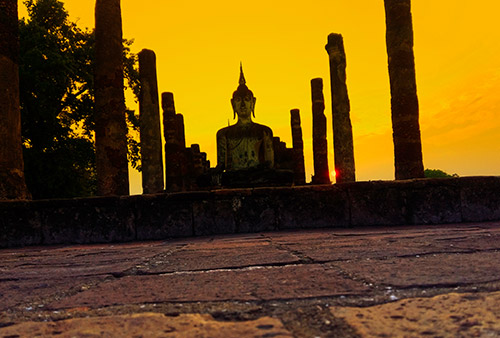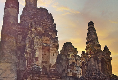 ยามที่เจดีย์ต้องแสงอาทิตย์ยามเย็น วัดมหาธาตุจะสวยราวกับภาพวาด และเมื่อดวงอาทิตย์เริ่มจะลับขอบฟ้า วัดมหาธาตุจะงดงามดังภาพถ่ายซิลลูเอท