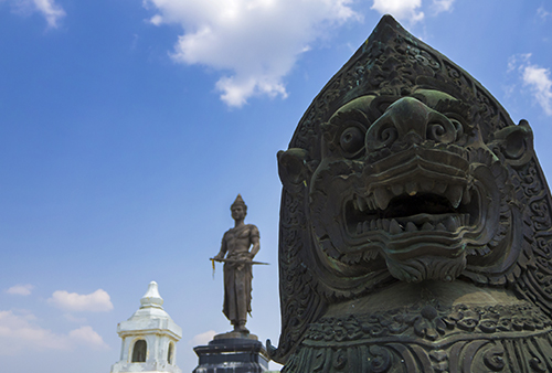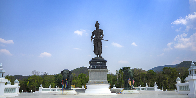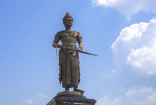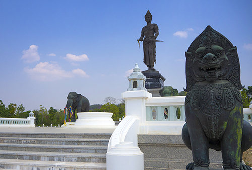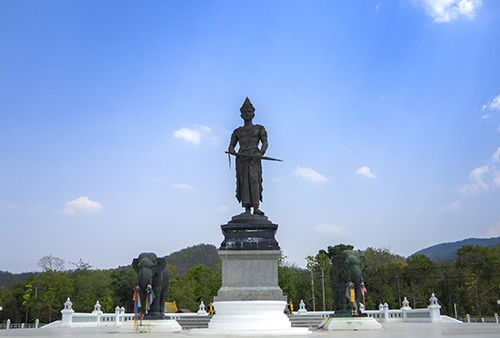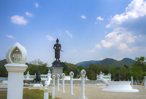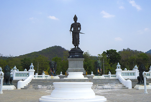 พระบรมราชานุสาวรีย์นี้ ฉลองพระองคือย่างกษัตริย์โบราณ ทรงถือพระแสงขรรค์ชัยศรี สัญลักษณ์แห่งพระราชอำนาจและความเข้มแข็งไว้ในพระหัตถ์ หันพระพักตร์ไปทางทิศเหนือ ด้านหลังพระบรมราชานุสาวรีย์เป็นภูเขา ทำให้มีบรรยากาศเข้มขลังยิ่งใหญ่ ด้านหน้ามีประติมากรรมสิงห์และช้างหล่อด้วยโลหะตั้งอยู่
